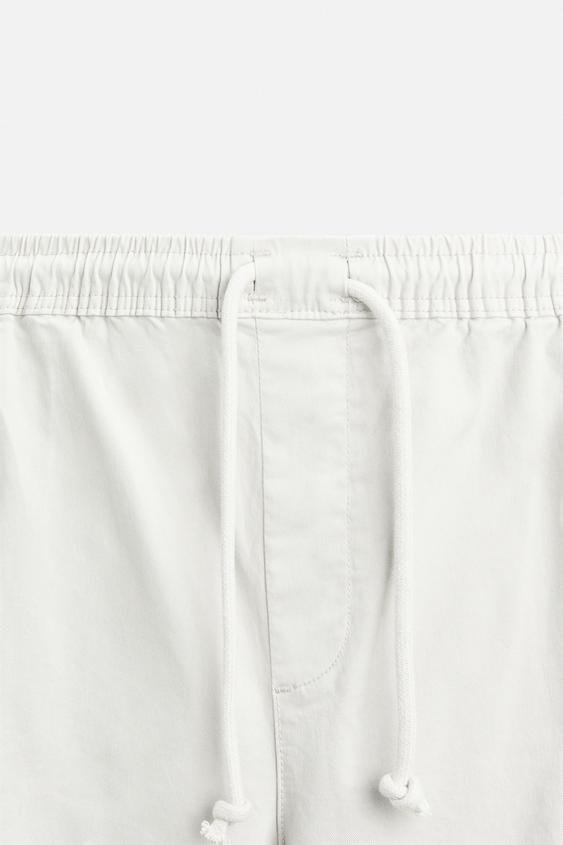 Relaxed fit pants. Adjustable elastic waistband with drawstring. Front pockets and back welt pockets. Flap patch pockets at legs. Washed effect. Elastic cuffed hems.