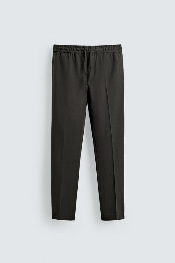 Regular fit pants made of stretchy fabric. Adjustable elastic drawstring waistband. Side pockets and back welt pockets.