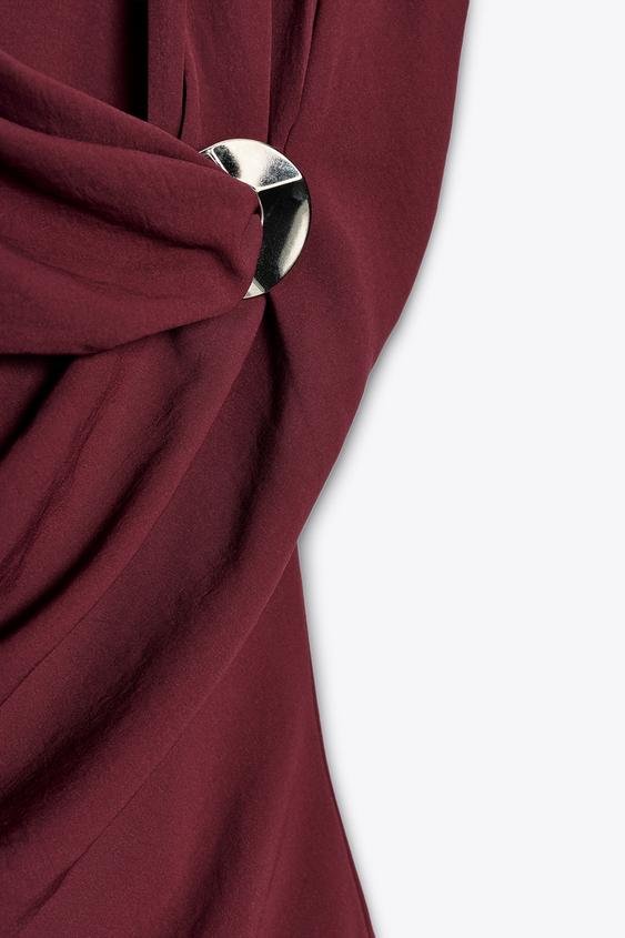Flowy neck dress with gold appliqué and sleeveless design. Pleated trim detail. Hem with back vent. Back hidden in-seam zip closure.