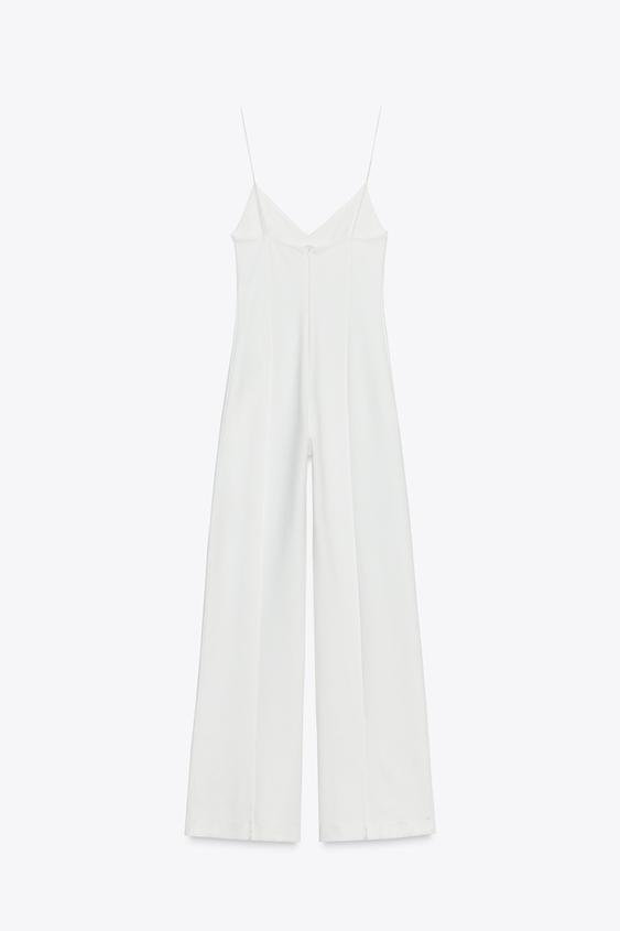 Jumpsuit made of elastic and flexible knit fabric with a compact, soft, and opaque weave. V-neck and thin straps. Wide leg.