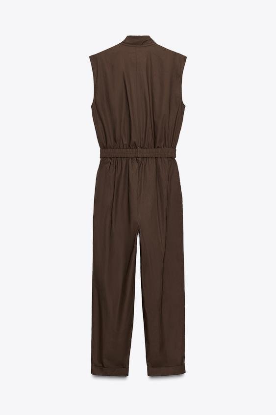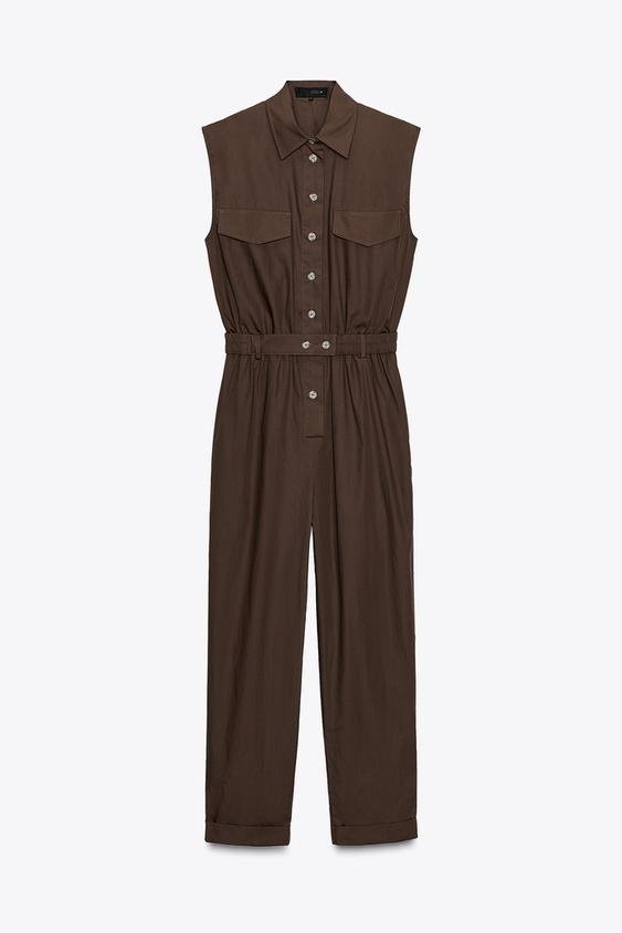 Sleeveless jumpsuit with a lapel collar. Front flap detail. Matching elastic belt. Hidden side seam pockets. Cuffed hem. Front button closure.