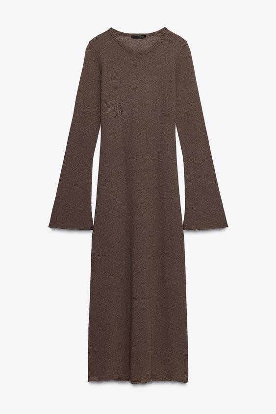 Long dress with a round neck and long sleeves. Textured fabric detail. Straight hem.