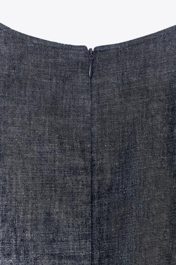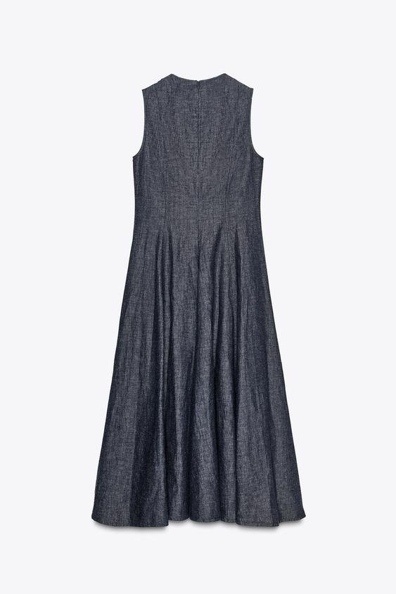 Midi dress made of denim-like fabric. Round neck and sleeveless. Flared hem. Front closure with concealed zipper in seam.